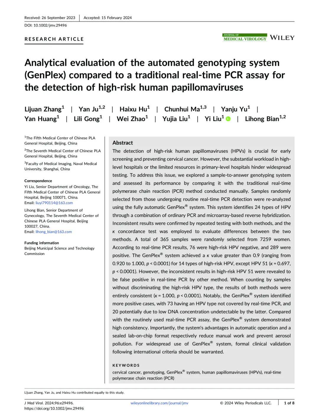 近日,中國(guó)人民解放軍總醫(yī)院第五醫(yī)學(xué)中心劉毅教授團(tuán)隊(duì)在《Journal of Medical Virology》(影響因子=12.7)發(fā)布了一項(xiàng)關(guān)于高危HPV檢測(cè)的重要研究成果,題目為“Analytical evaluation of the automated genotyping system (GenPlex) compared to a traditional real‐time PCR assay for the detection of high‐risk human papillomaviruse”。(全自動(dòng)基因分型檢測(cè)系統(tǒng)(GenPlex)與傳統(tǒng)實(shí)時(shí)熒光PCR方法用于檢測(cè)高危型人乳頭瘤病毒的分析評(píng)估)。